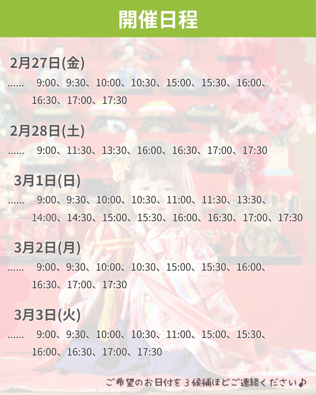 そこでご紹介させていただくのが、この ひなまつり撮影会 です!!