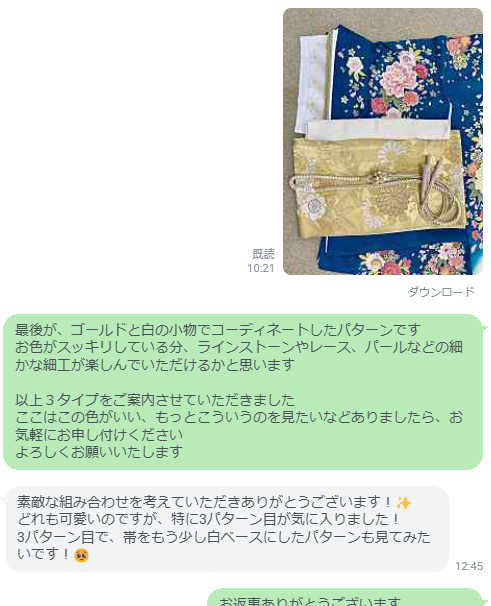 しかし、ご安心ください。私たちカネマタ衣裳店では、LINEでのご相談はもちろん、気になる振袖の宅配試着も承っておりますので、ご自宅にいながら納得いくまでお選びいただくことが可能です。