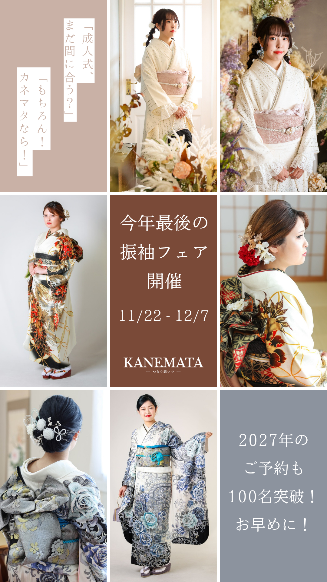 実は、カネマタ衣裳店では2027年ご成人の方のご予約が、すでに100名を突破しています!