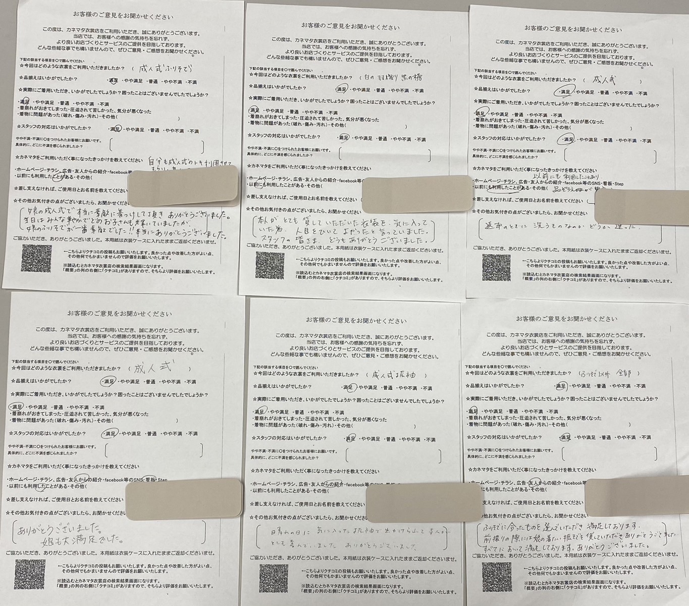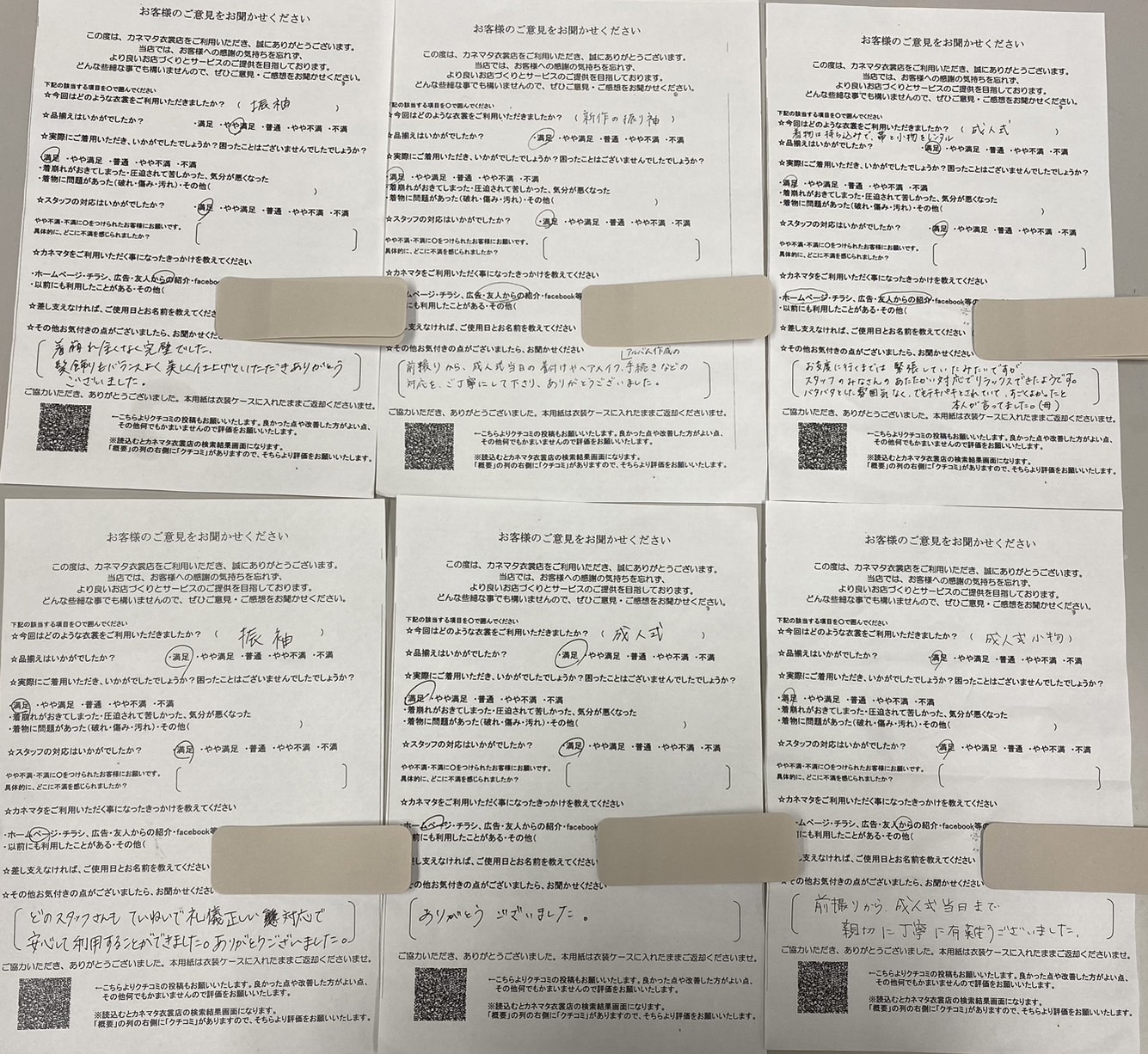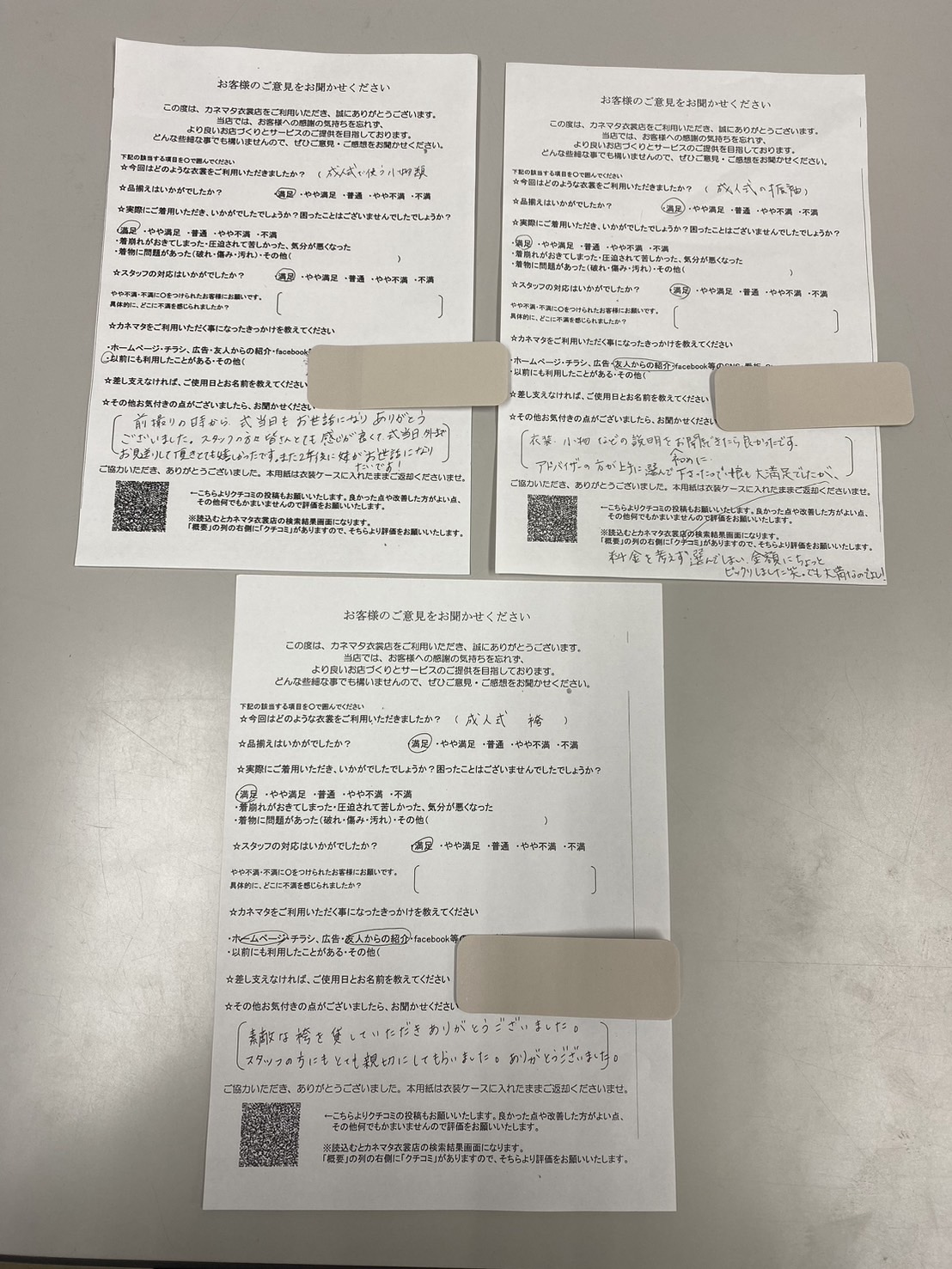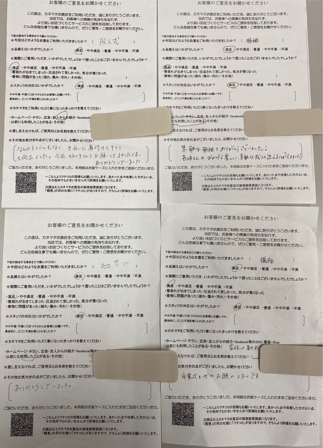 「ふりそでに合ったものを選んでいただき満足しております。前撮りの際には娘の着たい振そでを貸していただきありがとうございました。すべてにおいて満足しています。」